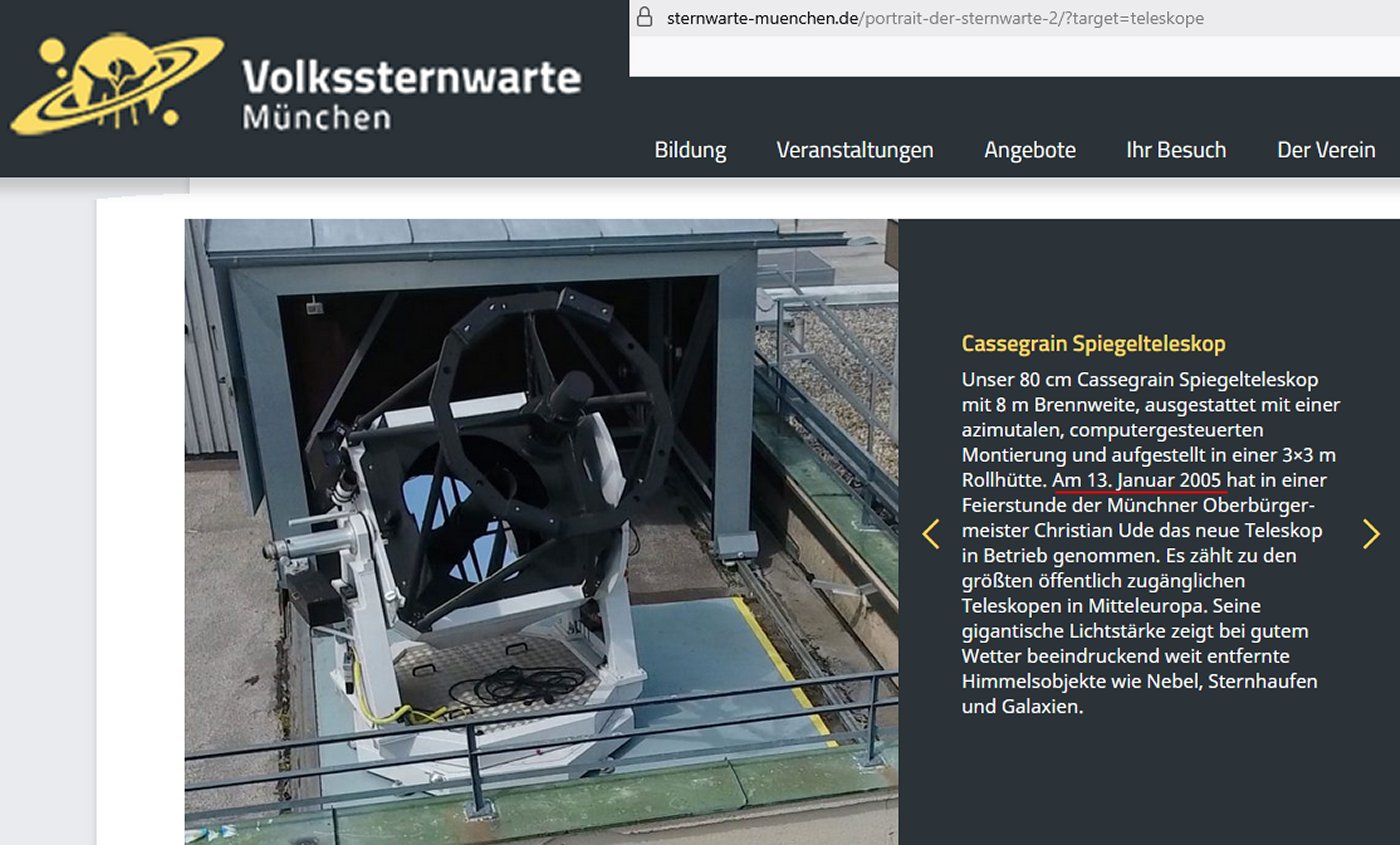 2025 feierte das 80cm Teleskop der VSW München sein 20 jähriges Jubiläum. Es ist das größte öffentlich zugängliche Teleskop in Bayern.