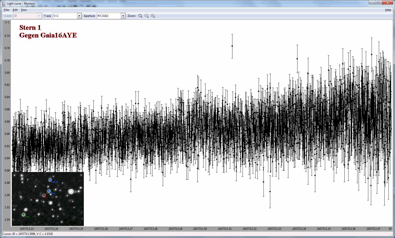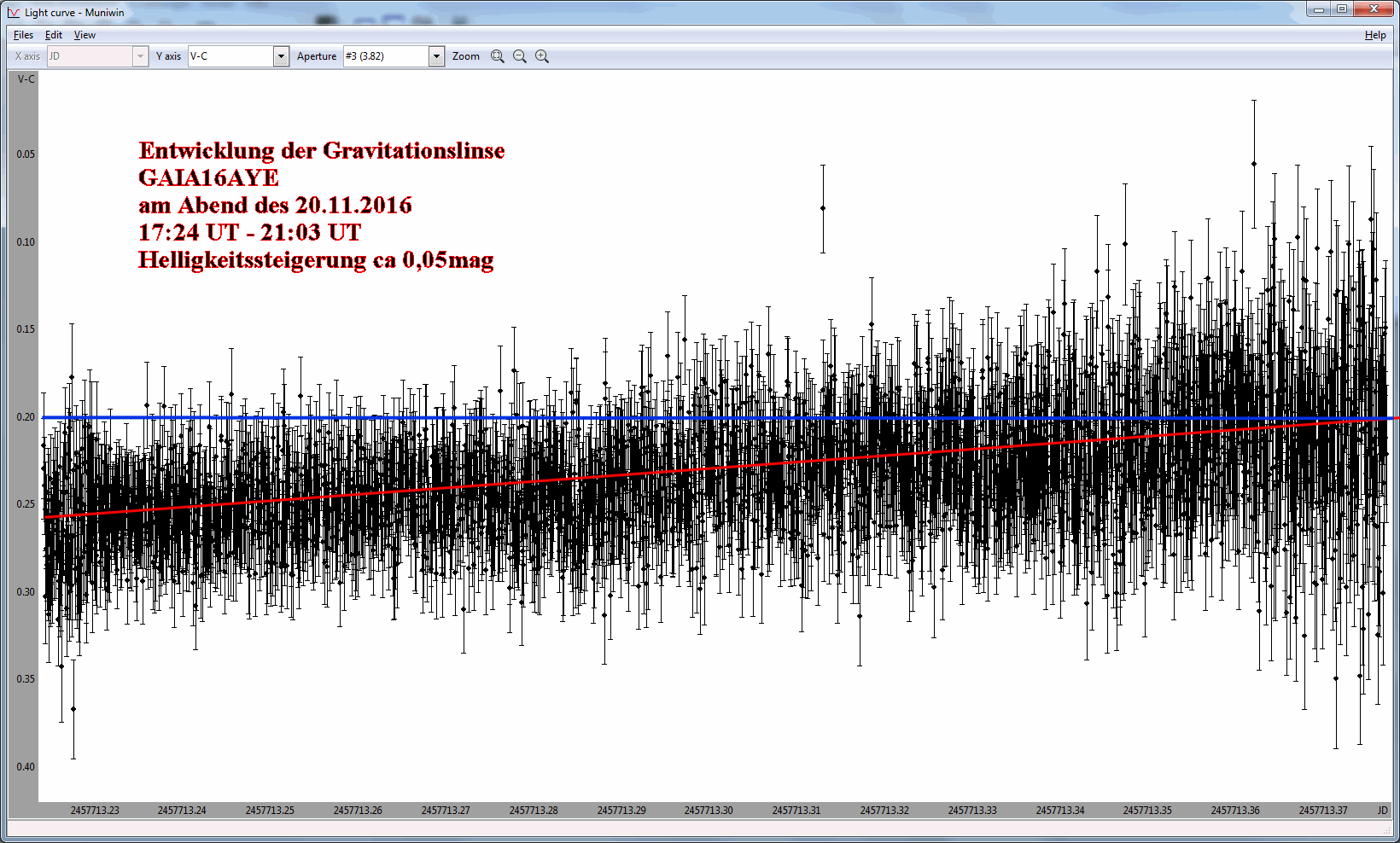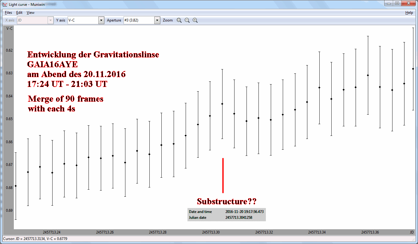 Es war aber eine feine Veränderung zu sehen. Zwischen 17:24 und 21:03 UT wurde ein schwacher Anstieg von 0,05 mag registriert. Die Linse wurde also langsam heller.