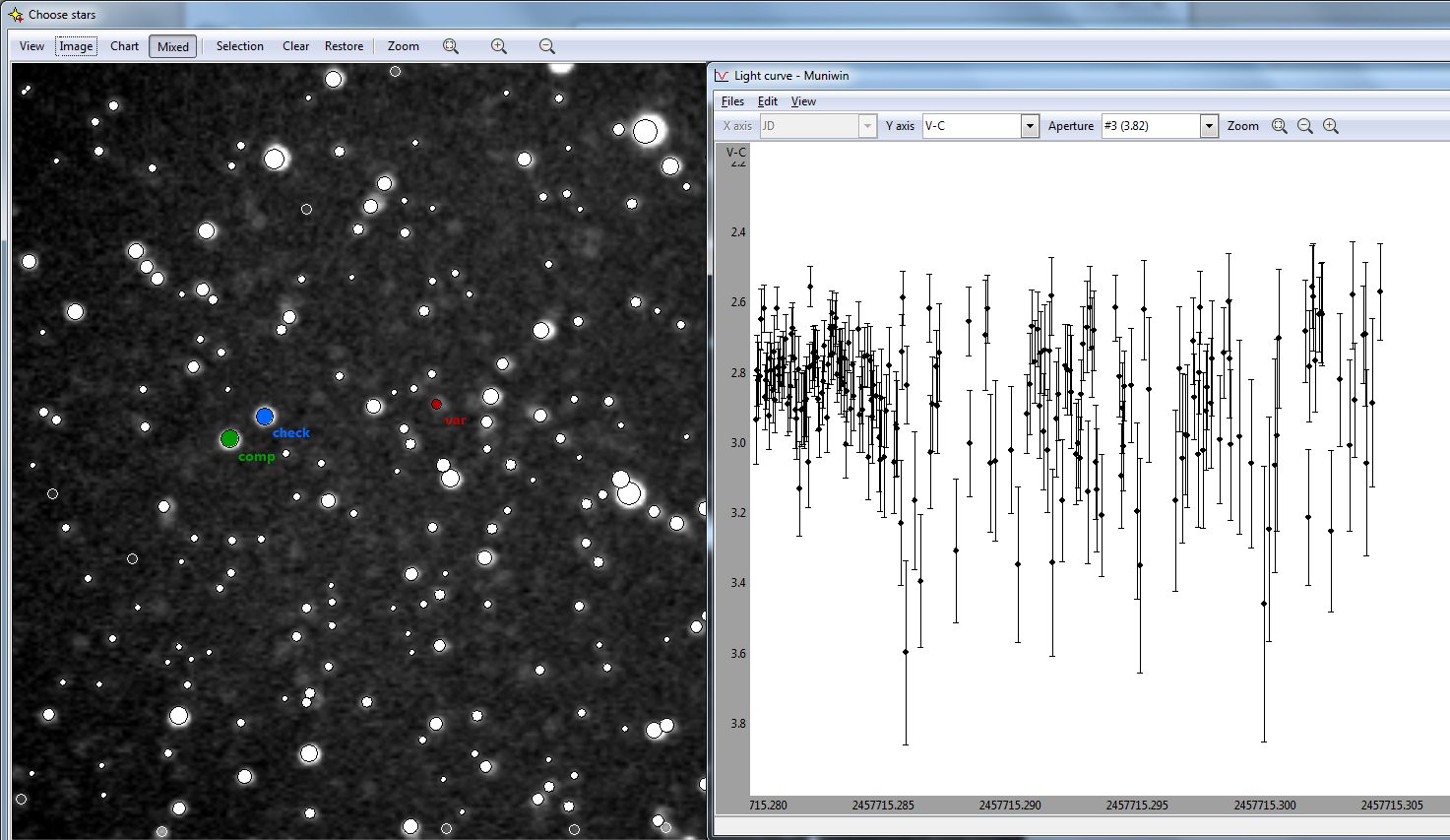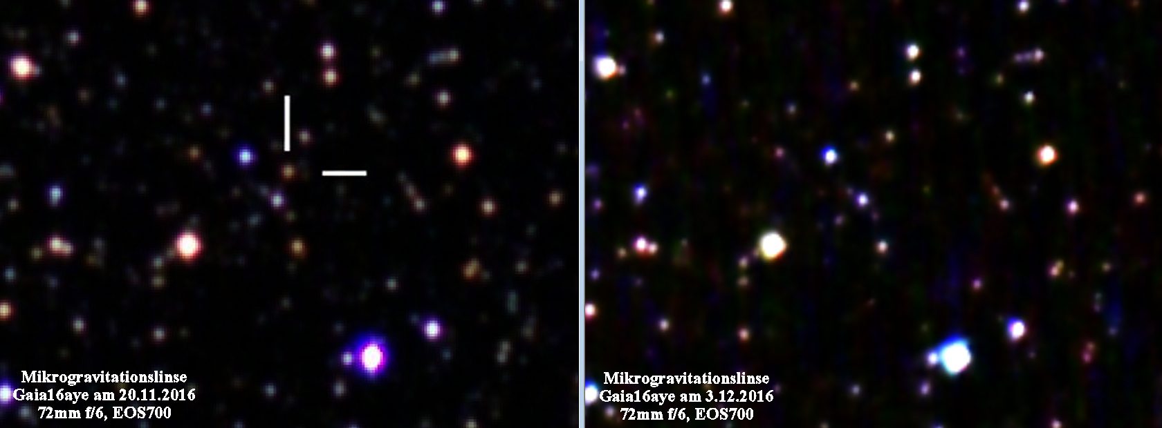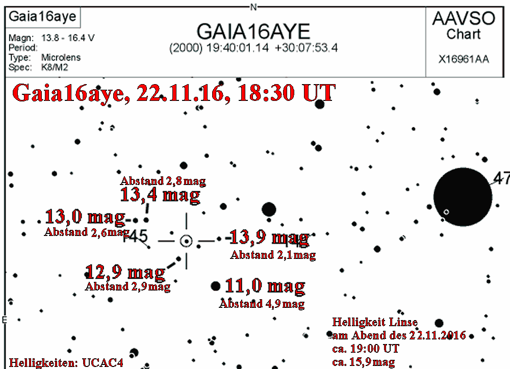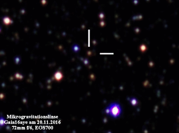 Es war aber eine feine Veränderung zu sehen. Zwischen 17:24 und 21:03 UT wurde ein schwacher Anstieg von 0,05 mag registriert. Die Linse wurde also langsam heller.