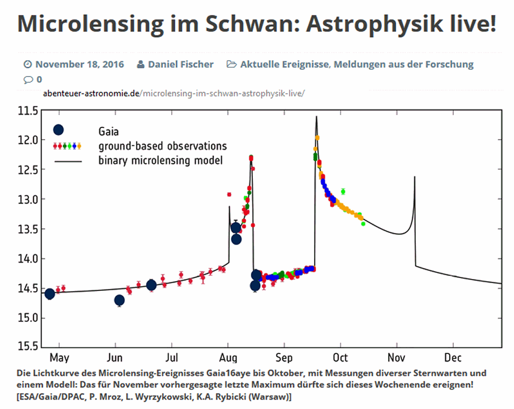 Der steile Anstieg der Linsenhelligkeit verschob sich auf den 21.11.2016. Leider herrschte an diesem Tag in München schlechtes Wetter, so dass das Helligkeitsmaximum nicht aufgezeichnet werden konnte. Am 22.11.2016 gab es bei diesigen Wetter einige Wolkenlücken und es war eine erneute Messung möglich. Die Kaustik war durchgelaufen und der Stern hatte wieder seine normale Helligkeit.