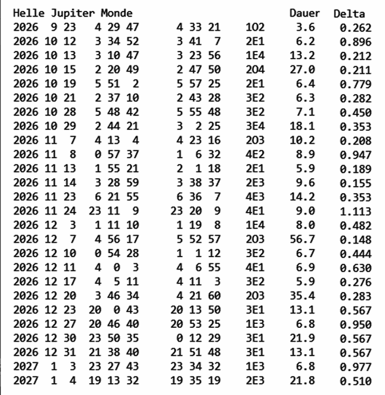 Jupitermondbedeckungen und Verfinsterungen geben. Eine Liste der