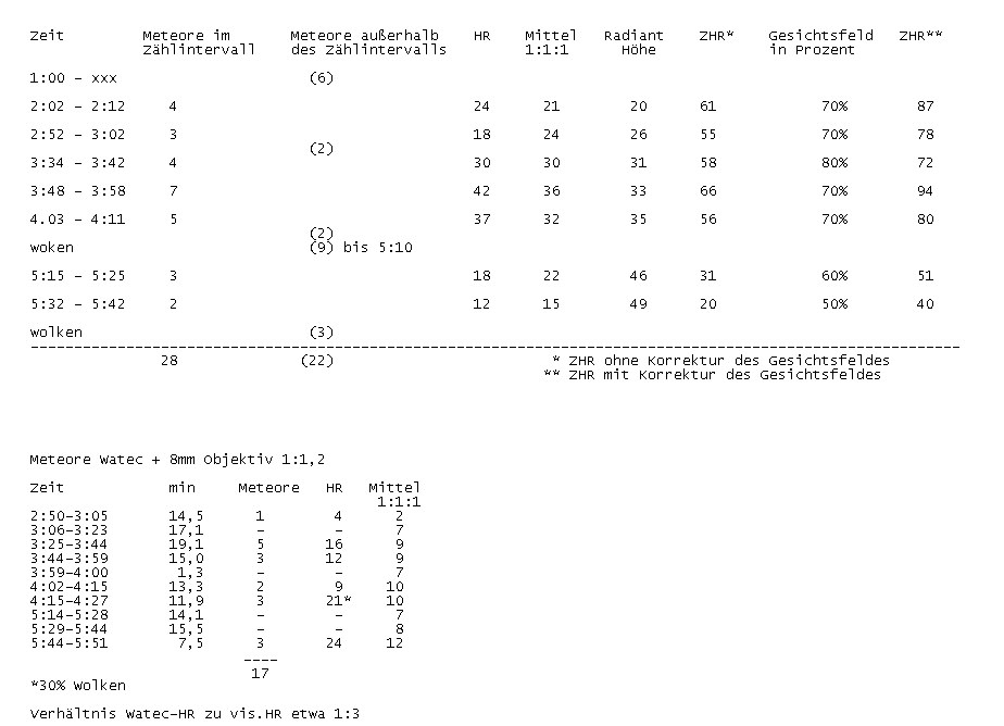 einzelne Schnuppen gesichtet werden. Insgesamt wurden etwa 50 Exemplare gezählt.