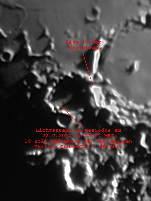 Bedingungen fällt auf dem Mond ein Lichtstrahl durch eine Lücke in der Wand des Kraters Hesiodus und