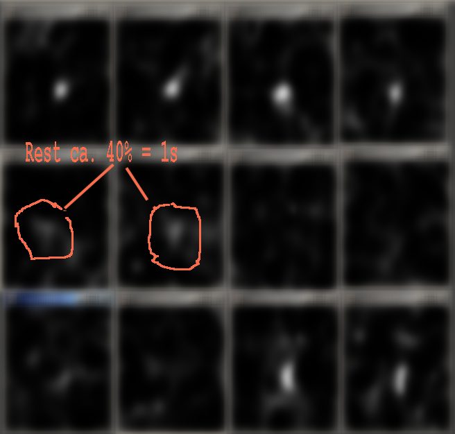 Luisa von 4:49:36 bis 4:49:51,2. Durch Deinterlace wurden die Bilder auf 1,28s reduziert,