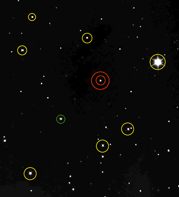 Die gelb eingekreisten Orientierungssterne wurden im Okular ebenfalls gesichtet.