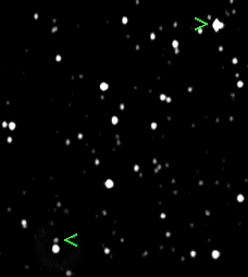 500 Bilder a 1,28 sec gemittelt. Der Zielstern ist oben rechts und der Planetoid unten links markiert.