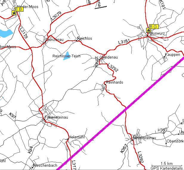 Die Lage unserer beiden Standorte relativ zur von Jan Manek berechneten Zentrallinie.