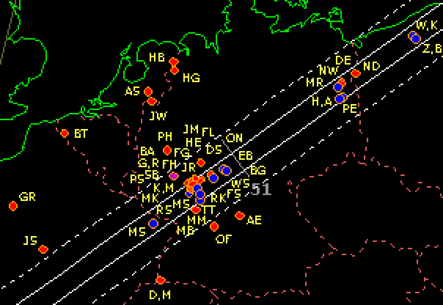 Die orangen Punkte zeigen die Beobachter die diesmal Pech gehabt haben. Die Finsternisspur hatte