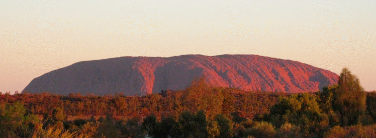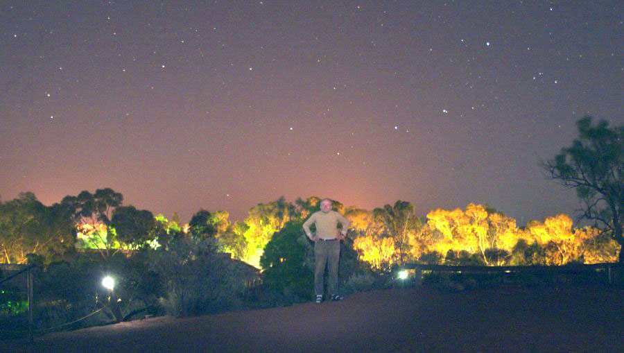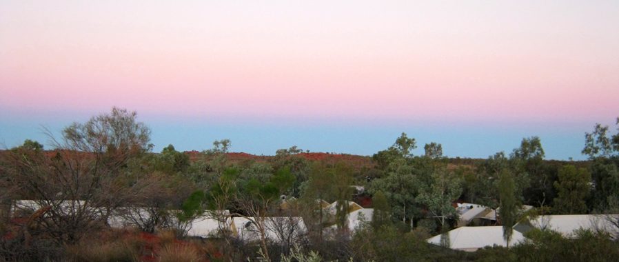 Das Bild zeigt den Blick zurück auf Yulara. Rechts ist noch partiell die Venus zu sehen