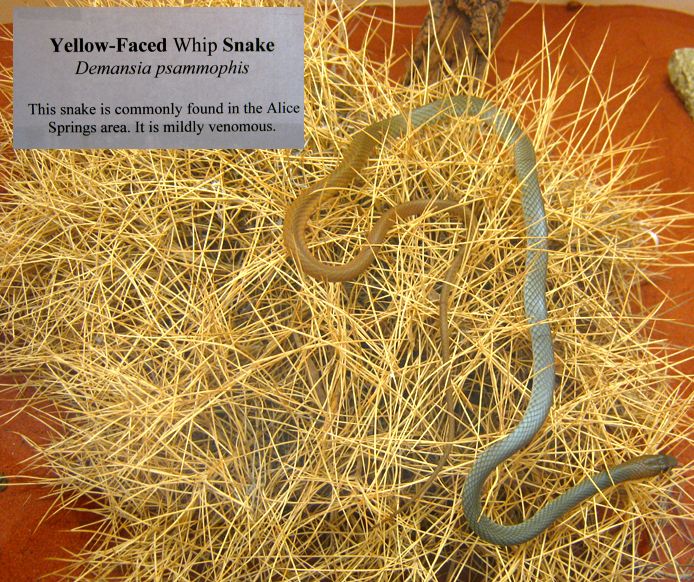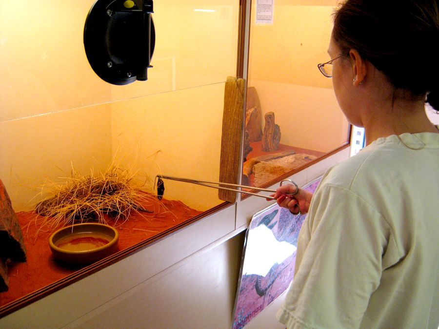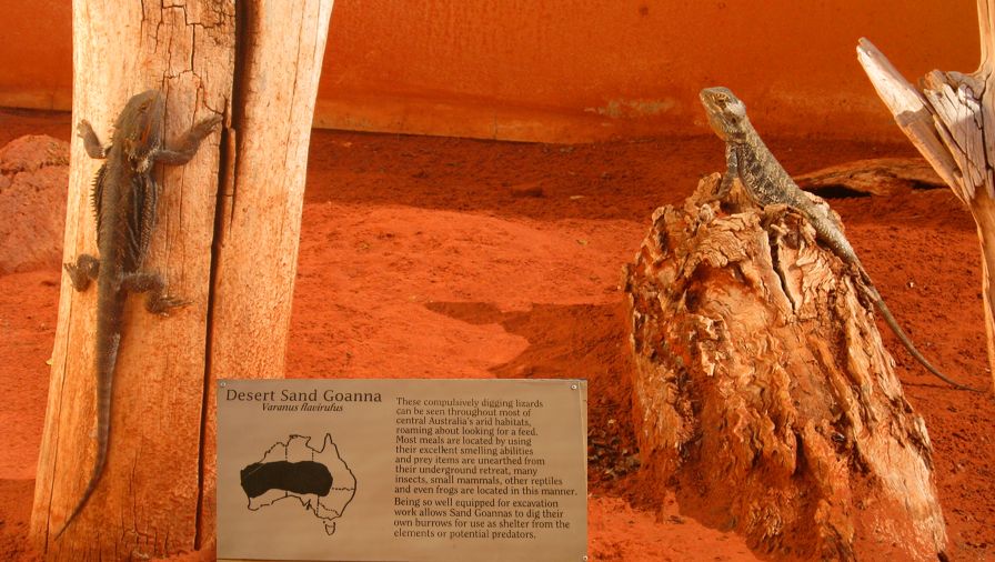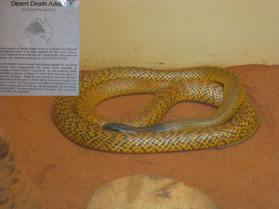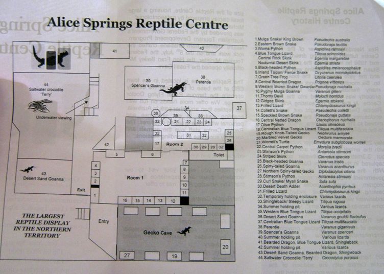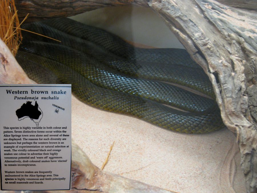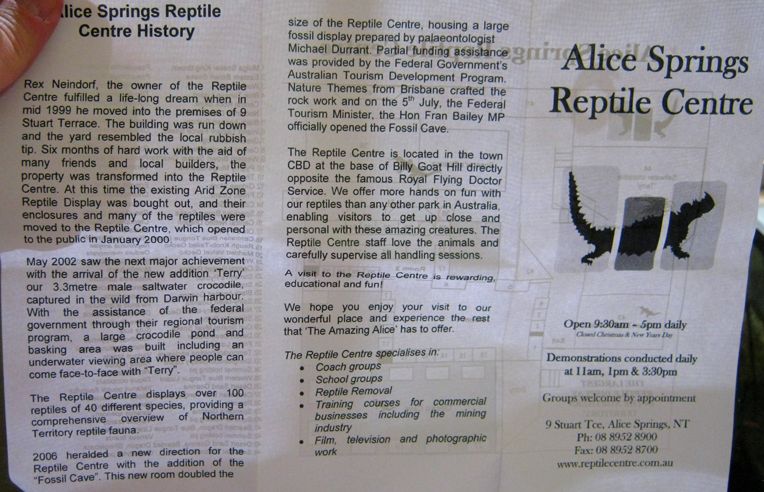 Alice Springs ist eine Stadt mit etwa 30.000 Einwohnern. Tourismus ist der wichtigste Wirtschaftsfaktor. Um die Besucher zu unterhalten wurden einige Museen und Sehenswürdigkeiten errichtet. Wir besuchten als erstes das Reptiliencenter. Australien ist ein Land der Reptilien. Das warme Klima begünstigt Schlangen und Eidechsen. Von den 20 giftigsten Schlangen der Welt leben 18 in Australien. Dennoch kommt es selten zu Unfällen weil die australischen Giftschlangen scheu sind und flüchten, wenn sie können. Wir haben nur wenige wilde Eidechsen gesehen und nur eine tote Schlange gefunden. Die Gekkos sind allerdings relativ häufig.