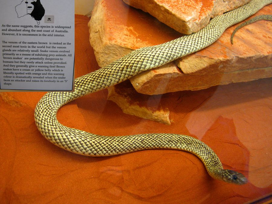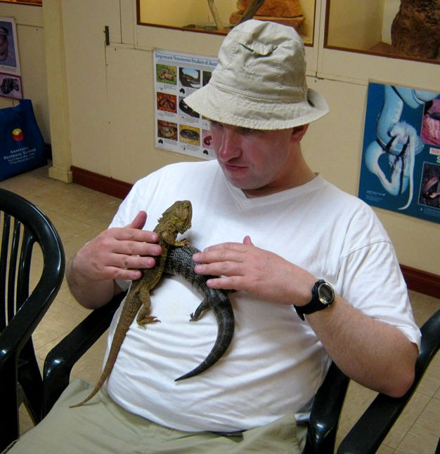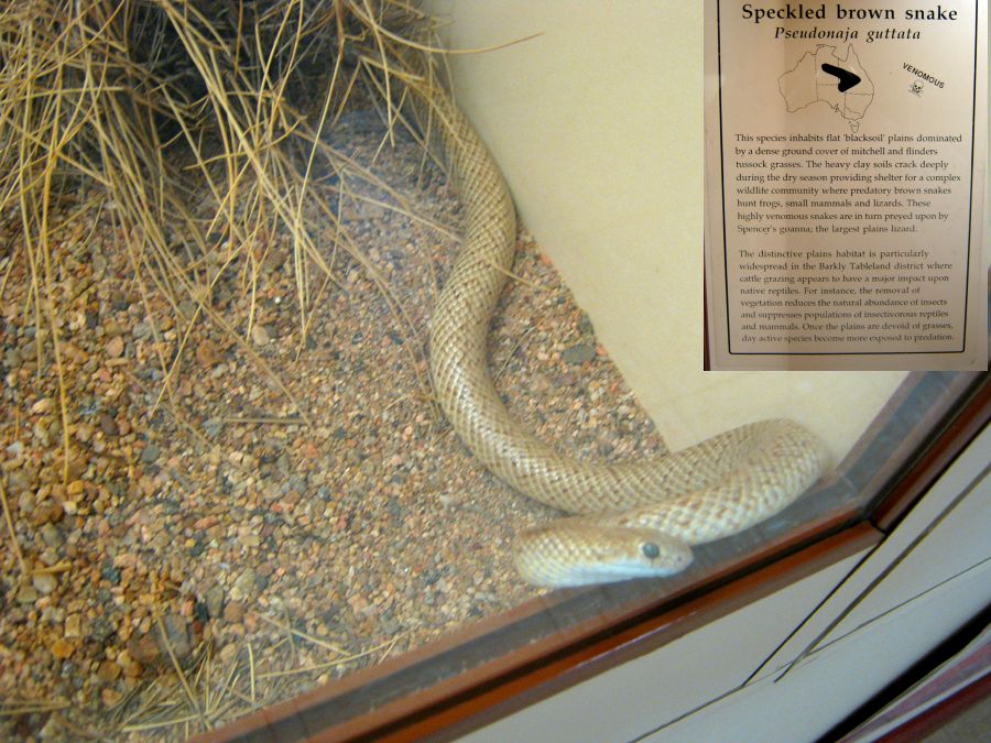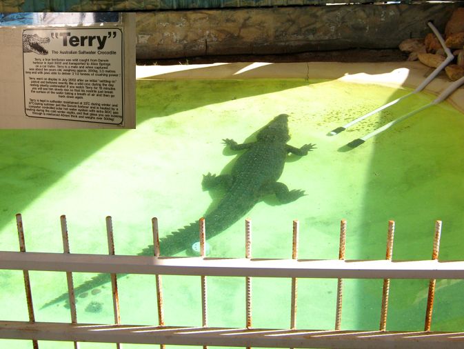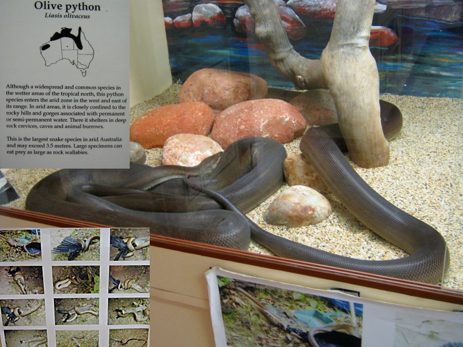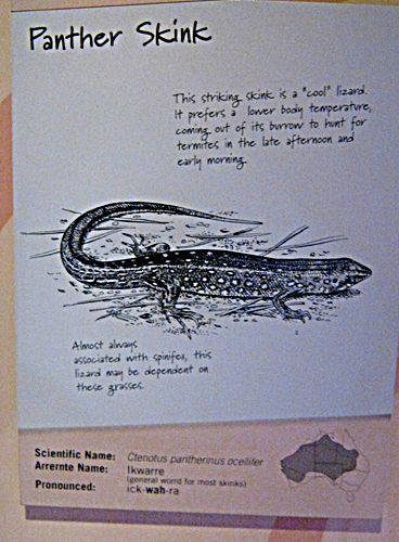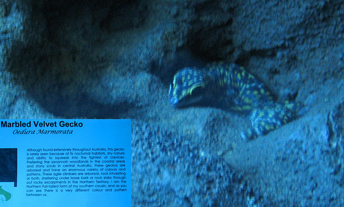 Alice Springs ist eine Stadt mit etwa 30.000 Einwohnern. Tourismus ist der wichtigste Wirtschaftsfaktor. Um die Besucher zu unterhalten wurden einige Museen und Sehenswürdigkeiten errichtet. Wir besuchten als erstes das Reptiliencenter. Australien ist ein Land der Reptilien. Das warme Klima begünstigt Schlangen und Eidechsen. Von den 20 giftigsten Schlangen der Welt leben 18 in Australien. Dennoch kommt es selten zu Unfällen weil die australischen Giftschlangen scheu sind und flüchten, wenn sie können. Wir haben nur wenige wilde Eidechsen gesehen und nur eine tote Schlange gefunden. Die Gekkos sind allerdings relativ häufig.