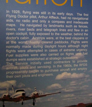 Gleich gegenüber der Reptilienstation befindet sich das Hauptquartier des Royal Flying Docter Service (RFDS). Diese in Australien sehr verehrte Institution sorgt seit den 20er Jahren aus der Luft für die medizinische Versorgung der Farmer im Outback.
