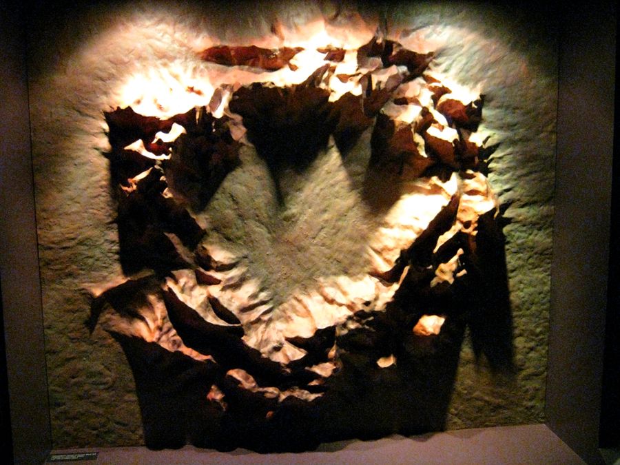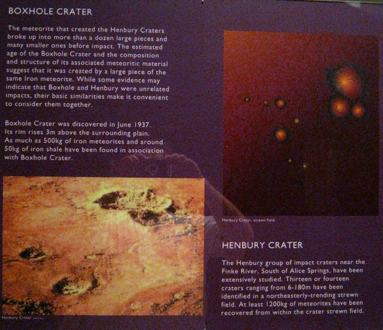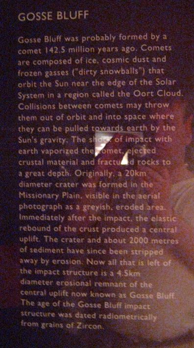 Für uns besonders interessant war die Ausstellung zu den lokalen Meteoritenkratern. Um Alice Springs gibt es 3 Einschlags-Krater. Gosse Bluff mit 22km Durchmesser,