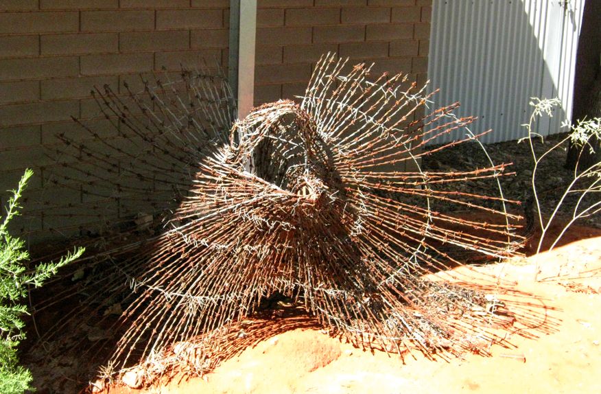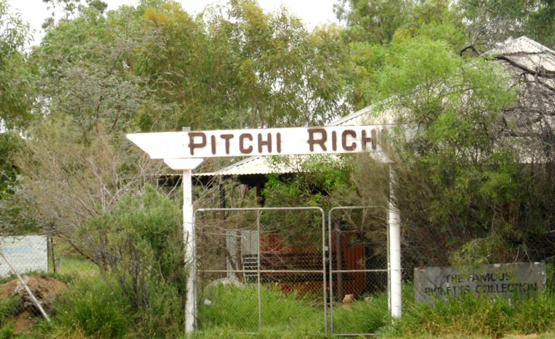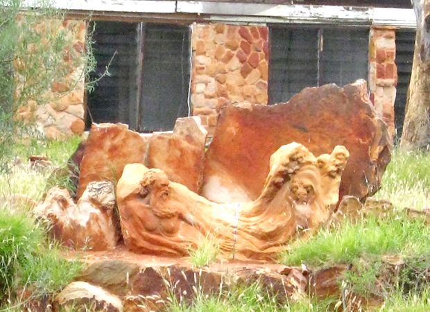 Gegenüber vom Hotel gab es ein heruntergekommenes Ausstellungsgelände mit Skulpturen lokaler Künstler namens Pitchi Richi. Vor dem Gelände wehte die Fahne der Aborigenies. Sie zeigt die gelbe Sonne über der roten Wüste.