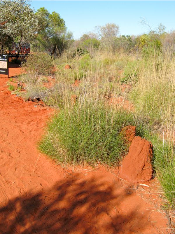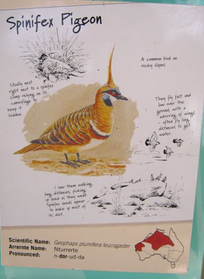 Ein Schwerpunkt lag bei den Vögeln und ihrem Bezug zu lokalen Umwelt. Hier Spinifexgras und Spinifex-Taube. Vor dem Gras sind Termitenhügel zu sehen.