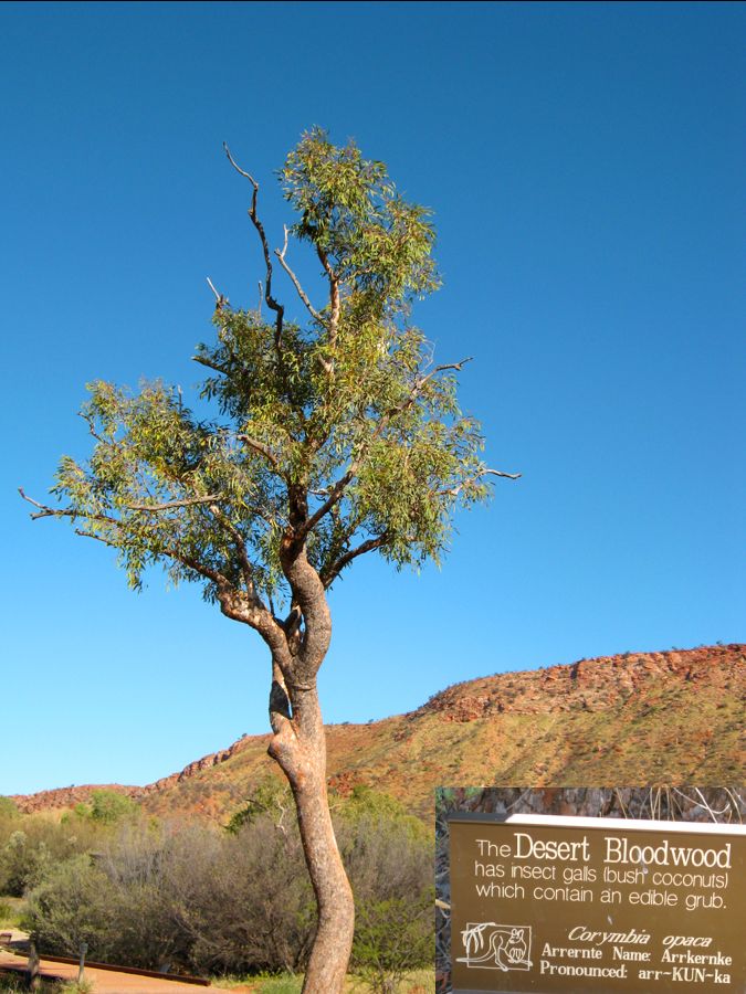 In Alice Springs gibt es anders als in Yulara keine Wüsteneichen. Eine der dominanten Baumarten ist der der Desert-Bloodwood. Er zählt zu den über 700 bekannten Eukalyptusarten.