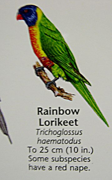 Auch ein bunter Papagei wurde direkt im Vorgarten gesichtet. Es handelt sich vermutlich um einen Regenbogen-Lori von dem es in Australien mehrere Unterarten gibt. Diesem Exemplar fehlte der sonst übliche rote Schnabel.