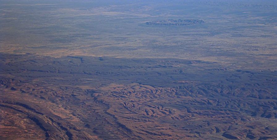 Der Gosse Bluff ist ein Doppelringkrater dessen äußerer Ring allerdings stark erodiert ist. Der etwa 4,5km große innere Ring ist dagegen sehr gut erhalten. Leider fehlte die Möglichkeit den Krater direkt zu besichtigen, doch beim Flug nach Perth war er am Horizont zu sehen.