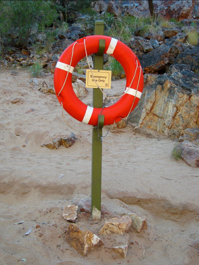 Am Ufer befindet sich als untypisches Wüstenutensil ein Rettungsring