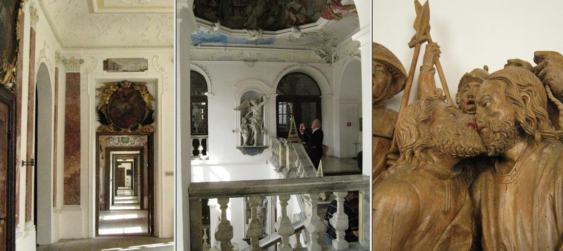 Blick durch die Gänge und eine Skulptur mit Judaskuss