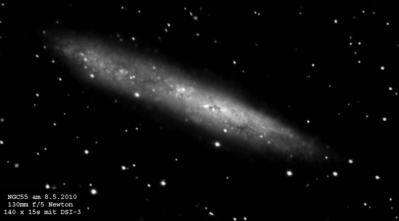 NGC 55. Trotzdem wird dieses System noch zur Lokalen Gruppe gerechnet. Die Bezeichnung Zwerg erscheint angesichts der Größe des Systems untertrieben. NGC55 gehört zu den hellsten und schönsten Galaxien des südlichen Sternenhimmels. NGC55 ist ein langgezogenes diffuses Band mit einem helleren und einem dunkleren Abschnitt. Im helleren Bereich sind im Teleskop 2 diffuse Konzentrationen zu sehen,