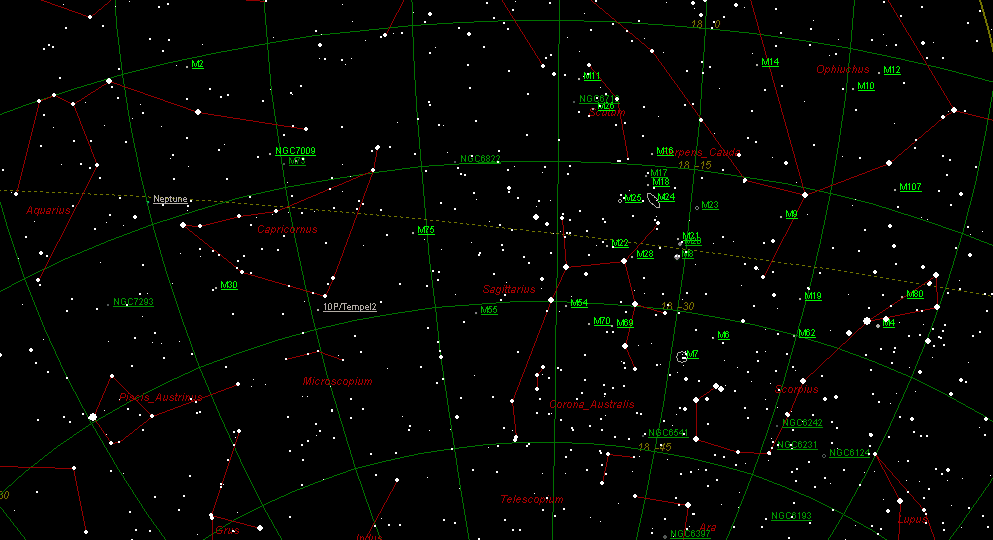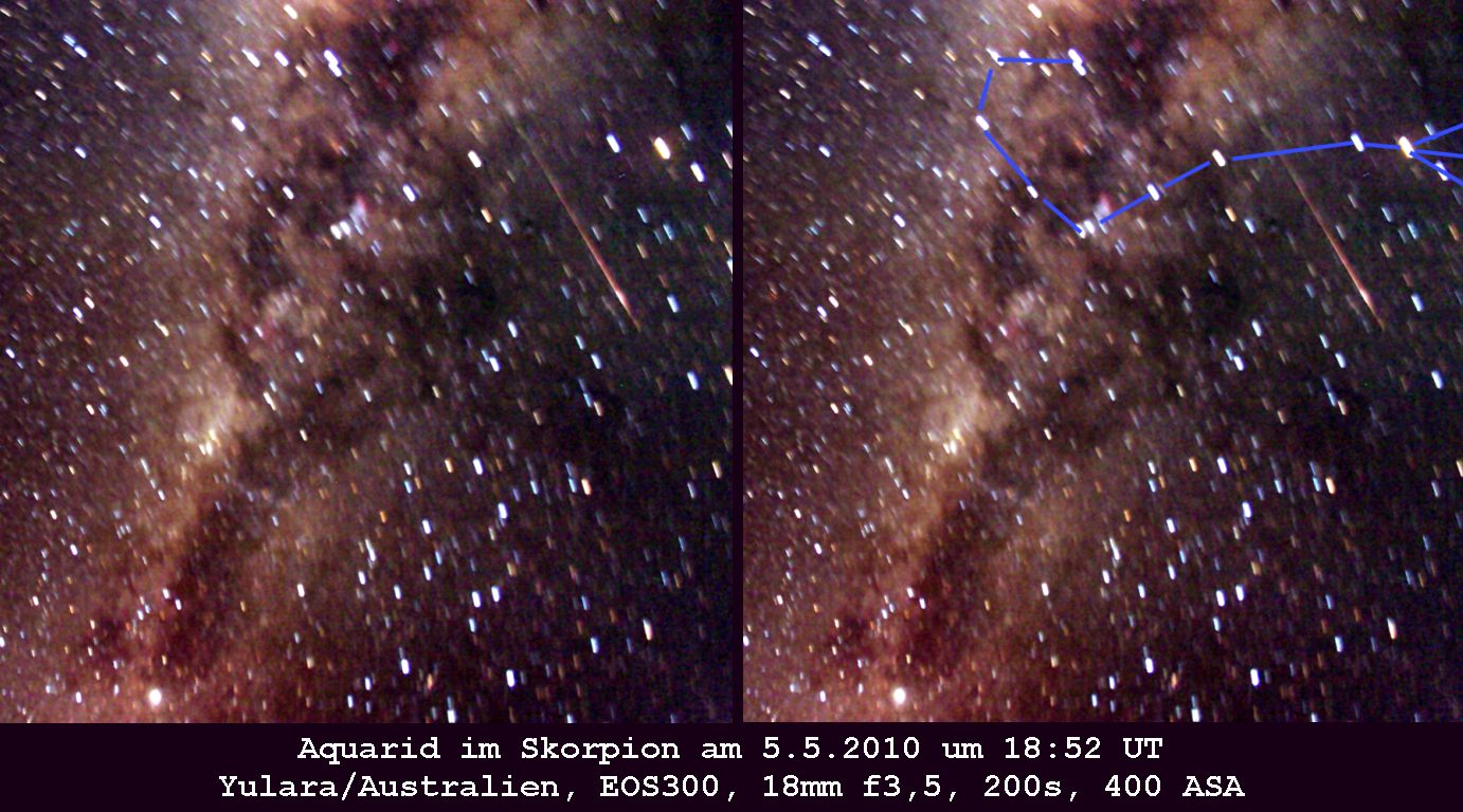 Ein Meteor wurde auch fotografiert. Er lief durch die südlichen Bereiches des Skorpion