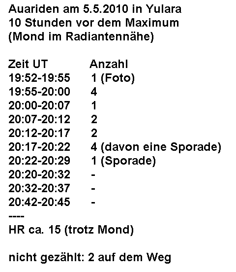 Zusammen mit dem niedrigen Radiantenstand müßte die ZHR bei etwa 40 gelegen haben.