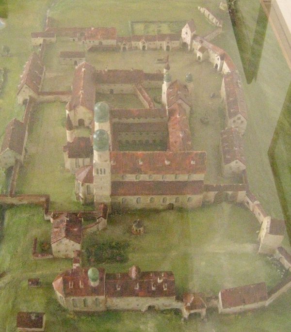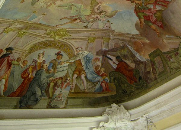 am Treppenaufgang verdeutlicht, auf dem der Abt vom Kaiser eine Urkunde erhält.
