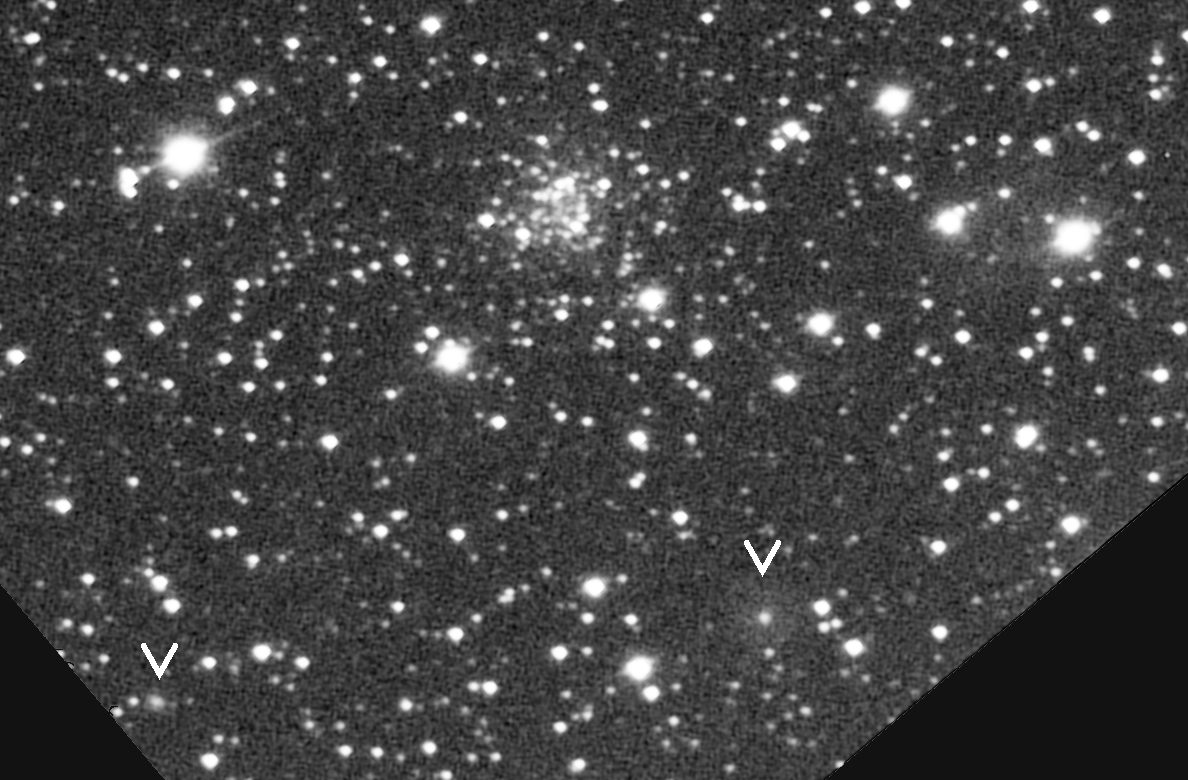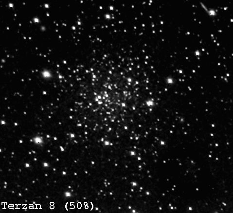 Auch bei Terzan-7 gab es 2 kleine nebelige Objekte, die sich als 17-mag Galaxien im ESO-Katalog wiederfanden. Das ist schon sehr interessant, denn die Terzans stehen ja alle unweit des galaktischen Zentrums und man würde eine starke Staubdämpfung erwarten. Offenbar gibt es hier Fenster die einen Blick weit hinter unsere eigene Galaxie erlauben. Unter der Annahme das Terzan-7 und Terzan-8 keiner starken Extinktion unterliegen und normale Kugelhaufen sind, müssen sie bei weniger als 12mag absolut sehr weit entfernt sein.