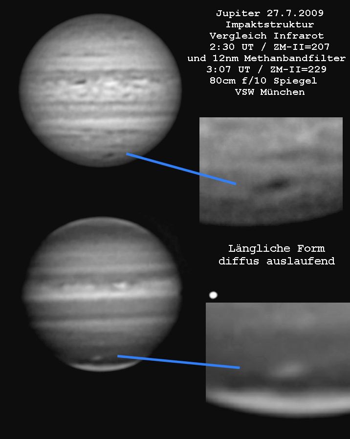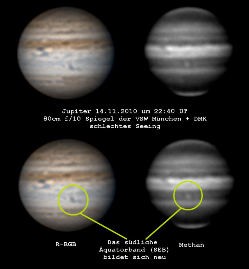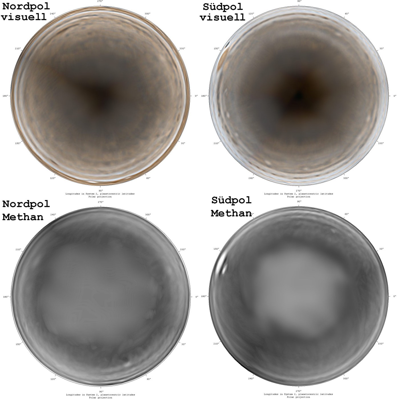 An den Polen wirkt der Jupiter im Methan heller als im normalen Bild.