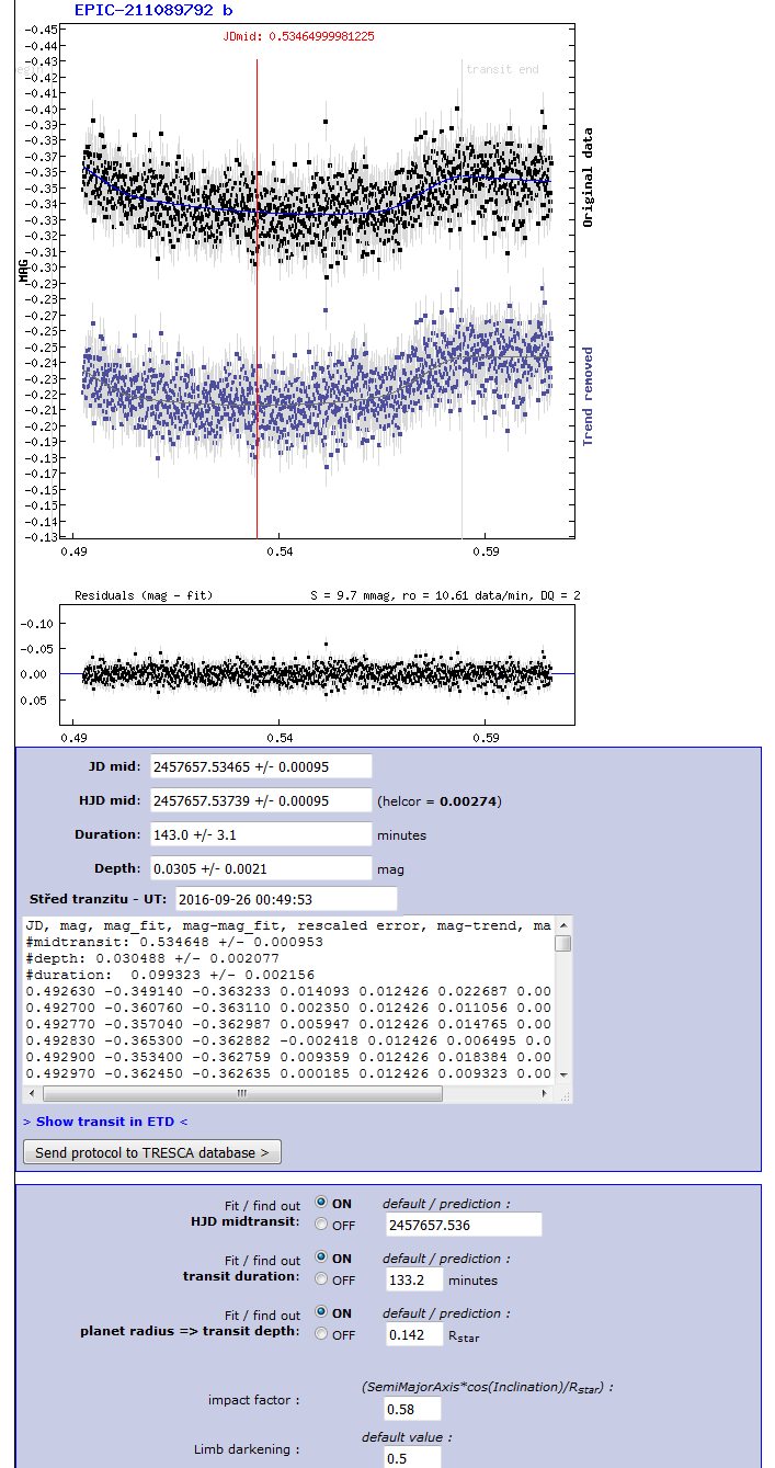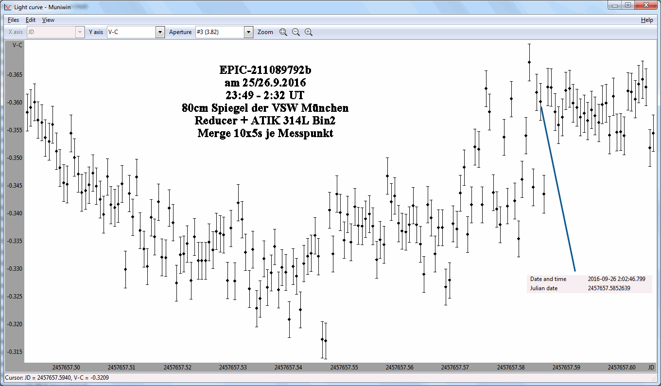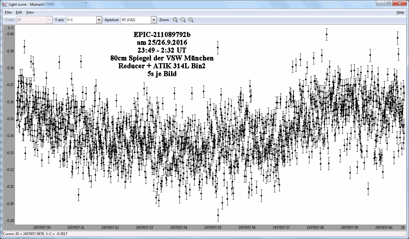 Dauer und Periode des Transits liegen im Rahmen der üblichen Messtoleranz. Bei der Amplitude lässt sich die Abweichung gut durch Binning und Bildverarbeitung erklären.