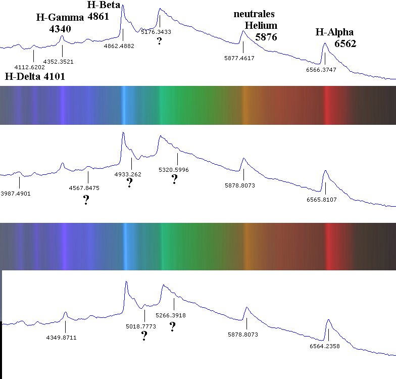 Dieses Spektrum zeigt praktisch nur Wasserstoff an. H-Alpha, H-Beta und H-Epsilon