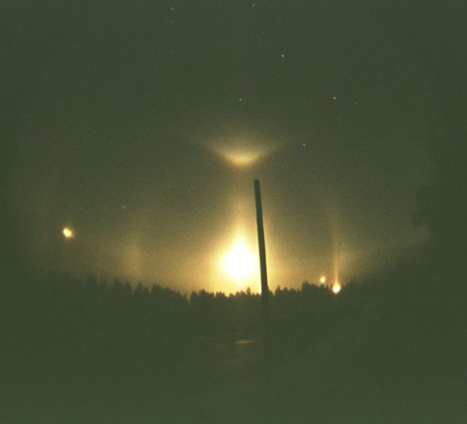 Nebenmonde zu sehen waren. Um den Mond selbst gab es kreuzförmige Streamer. Am