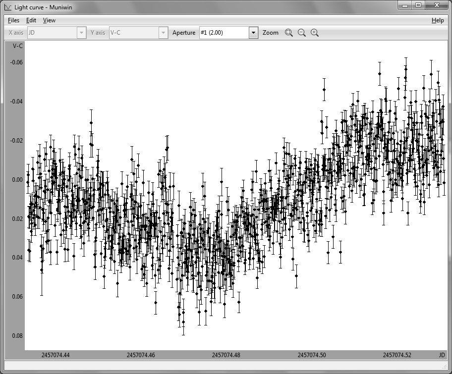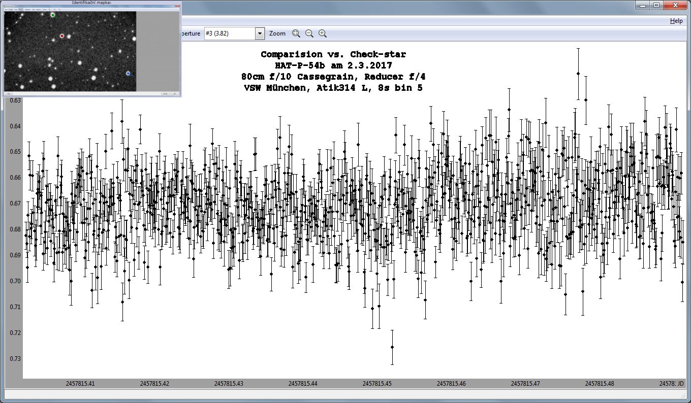 Eine Messung der Vergleichssterne untereinander bestätigt die geringe Streuung. Zum Ende der Messung verschlechterten sich allerdings die Bedingungen und der angezeigte Fehler wurde etwas größer.