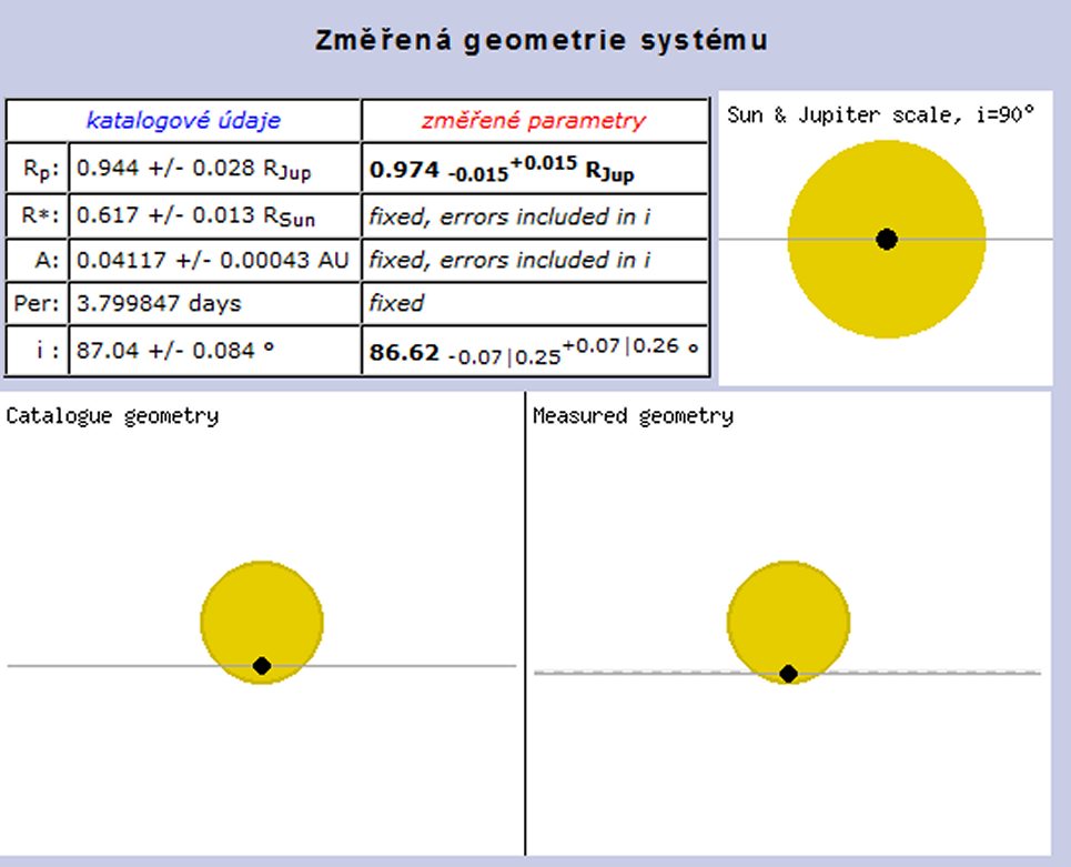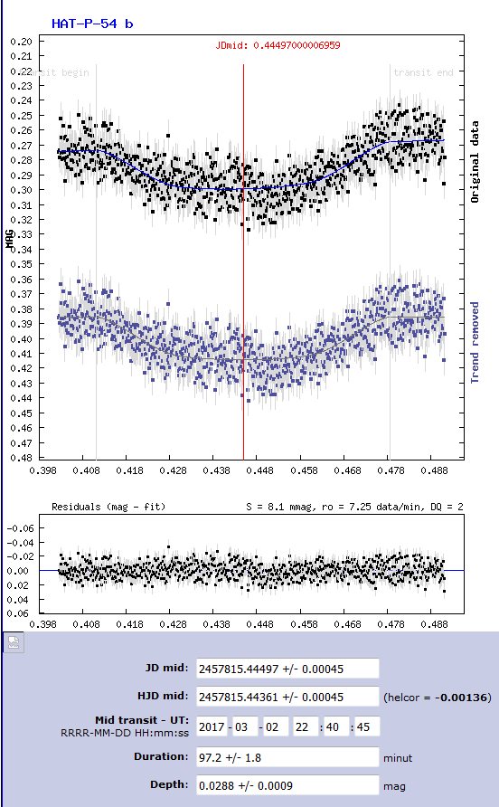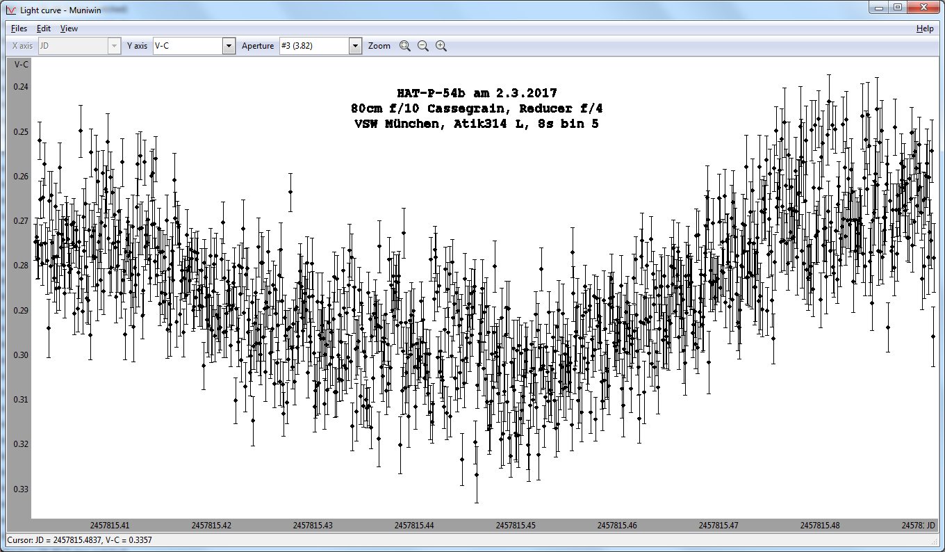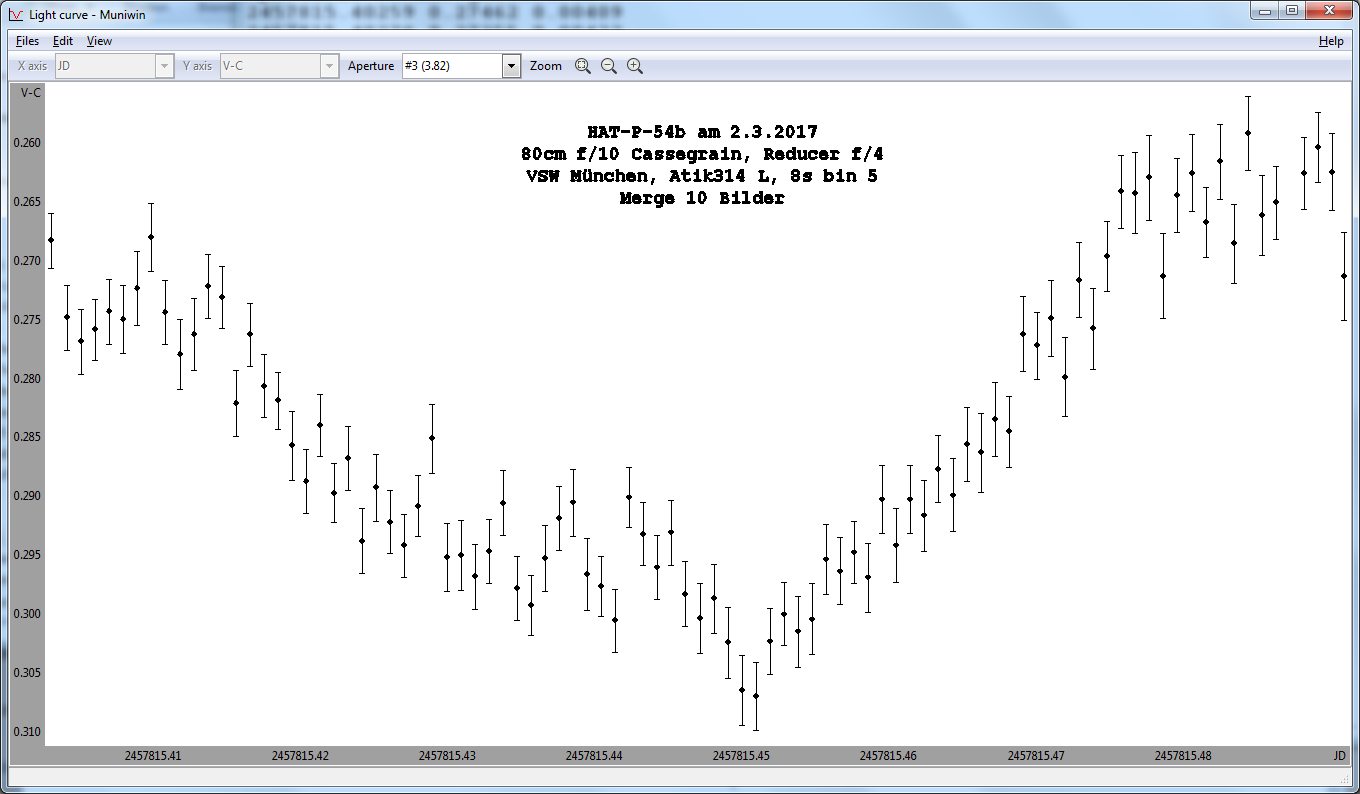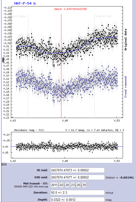 Die Beobachtung wurde nur 2 min vor dem errechneten Finsternisbeginn gestartet. Es dauerte jedoch noch einige Zeit bis der Lichtabfall begann. Die Auswertung mit der TRESCA-Datenbank bestätigte die unerwartete Kurve. Die Dauer wurde mit nur 92 min gemessen. Das sind 15 min weniger als prognostiziert.