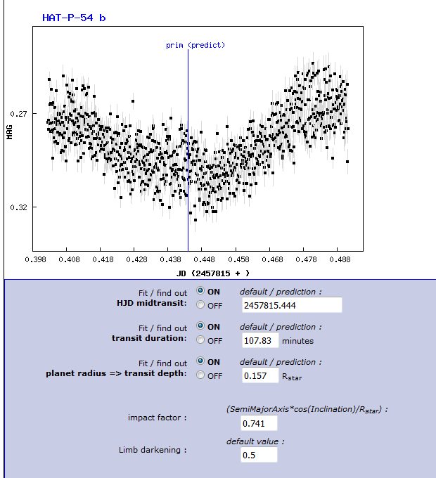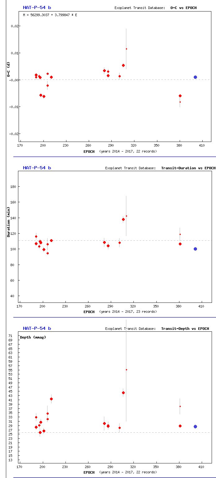 HAT-P-54b ist ein 13,5mag Stern mit Planetentransit in den Zwillingen. Die Periode ist 3.799847 Tage und die Amplitude 0,0265mag. Ab- und Anstieg der Helligkeit benötigen 107,83min.