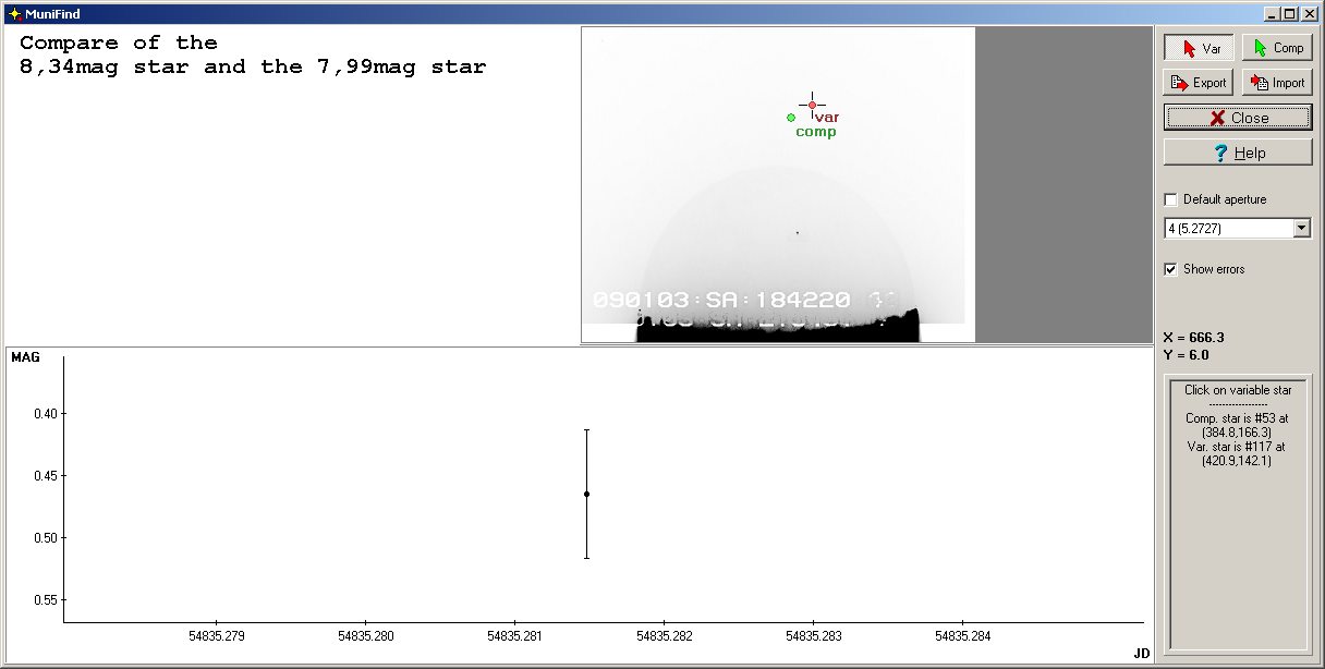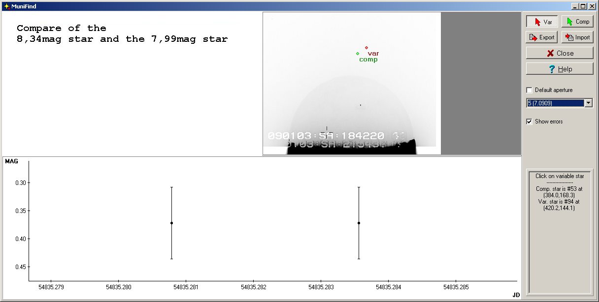 Während das Signal auf dem Video aus Bayrischzell ausgebrannt war und daher nur eine Schätzung anhand des Durchmessers auf 6,x mag möglich ist, war das Signal aus dem Stuttgarter Video prinzipiell für die Photometrie geeignet. Bei der dort verwendeten WATEC 902H2 SUPREME war jedoch