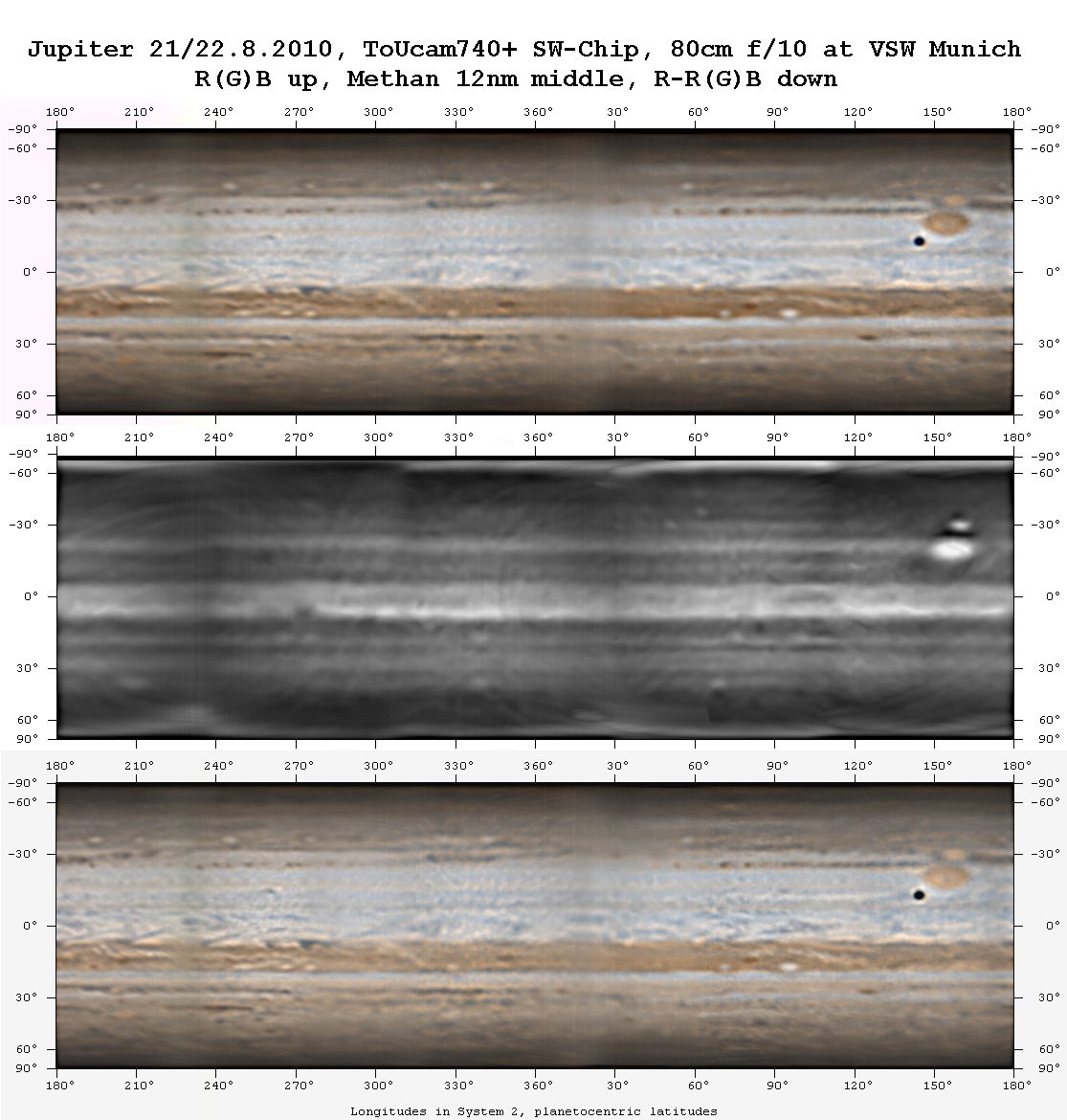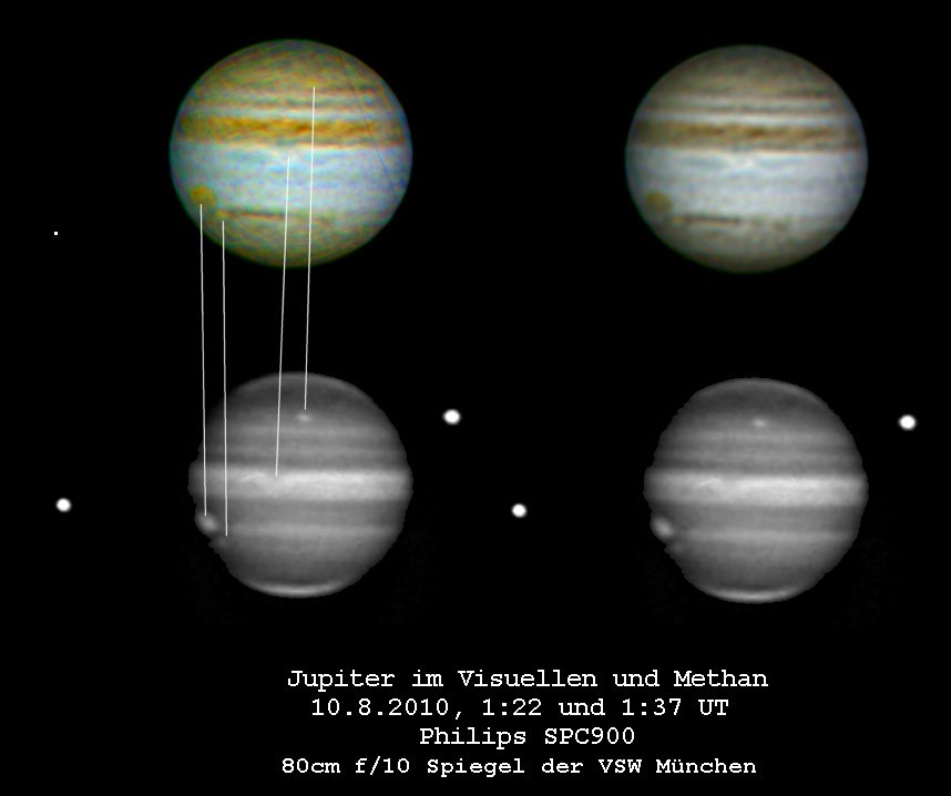 Auffallend ist die Methan-Helligkeit des kleinen roten Flecks in der nördlichen Polkappe.