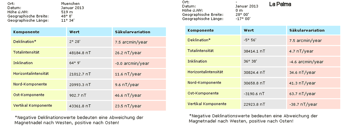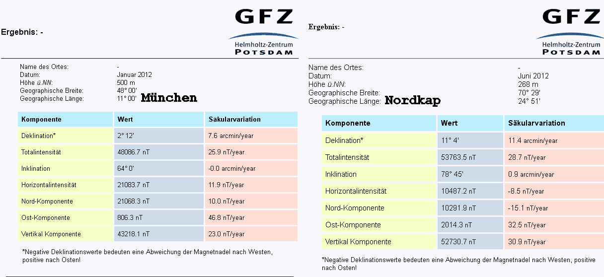 Es läßt sich vermuten, dass die polnahen Magnetfeldlinien weniger Kraft zur Nordausrichtung besitzen, als die eher horizontalen Linien in Deutschland. Messungen des GFS zeigen tatsächlich eine Halbierung der Nordkomponente und ein Ansteigen der Vertikalkomponente.