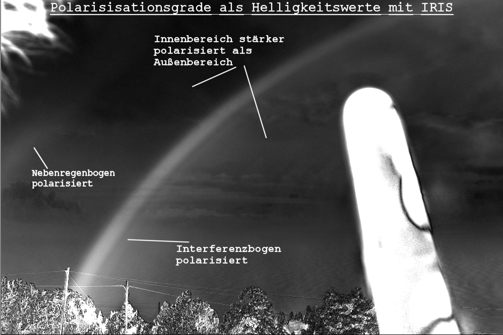 Da die Farbenlinien polarisiertes Licht sind, werden sie bei geeigneter Polarisation unterdrückt – kein Regenbogen ist sichtbar. Dreht man den Polfilter 90° aus dieser Position heraus, wird der Regenbogen fast vollständig durchgelassen, das zufällig polarisierte Licht der Wolken rundherum wird zu etwas mehr als der Hälfte geschluckt. Relativ zur Umgebung scheint der Regenbogen so viel kräftiger.