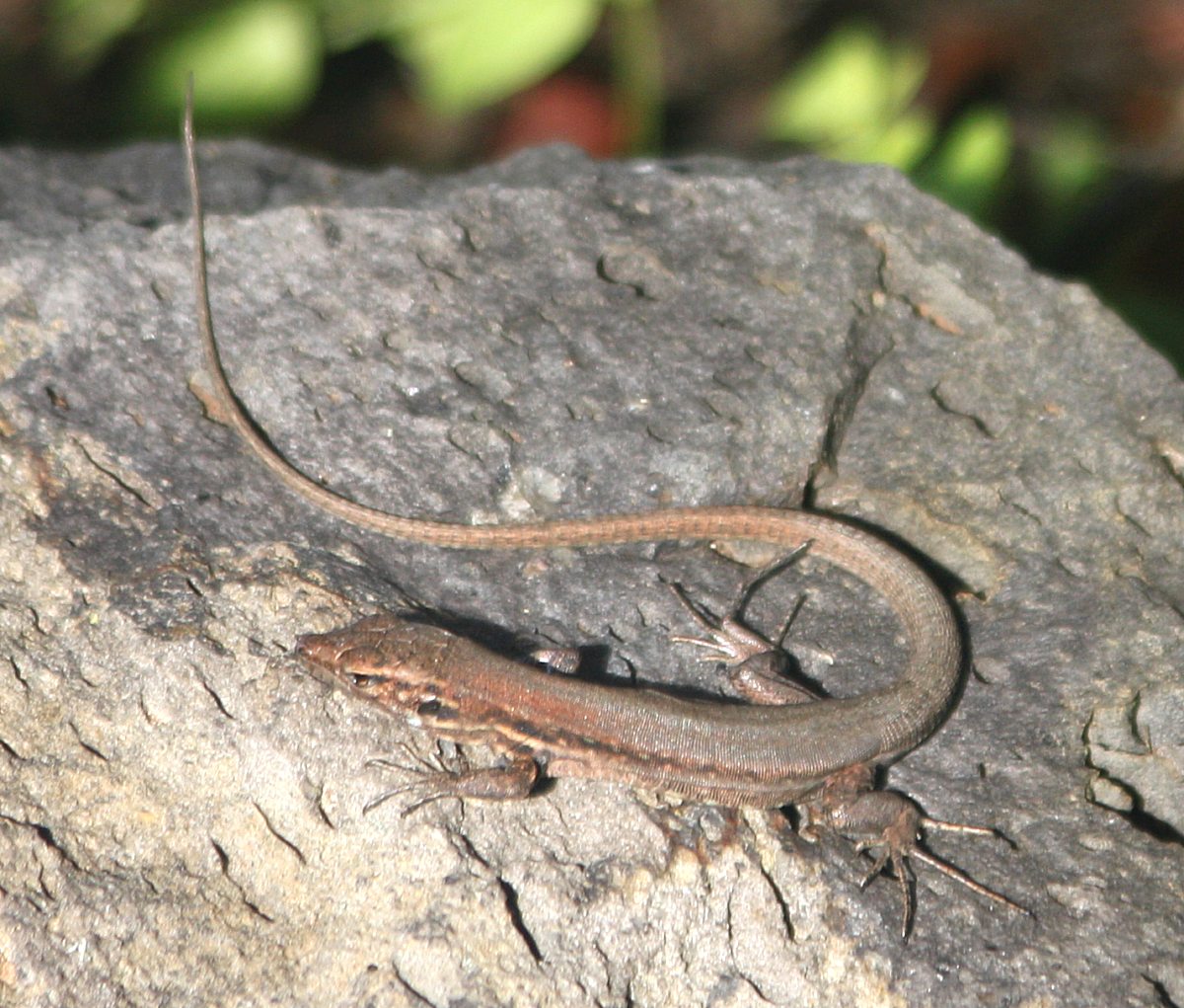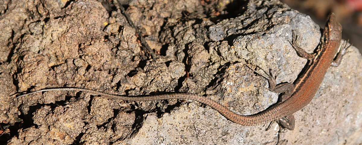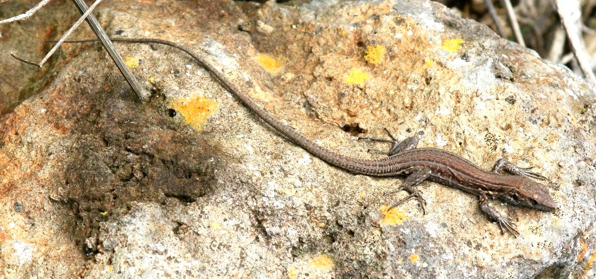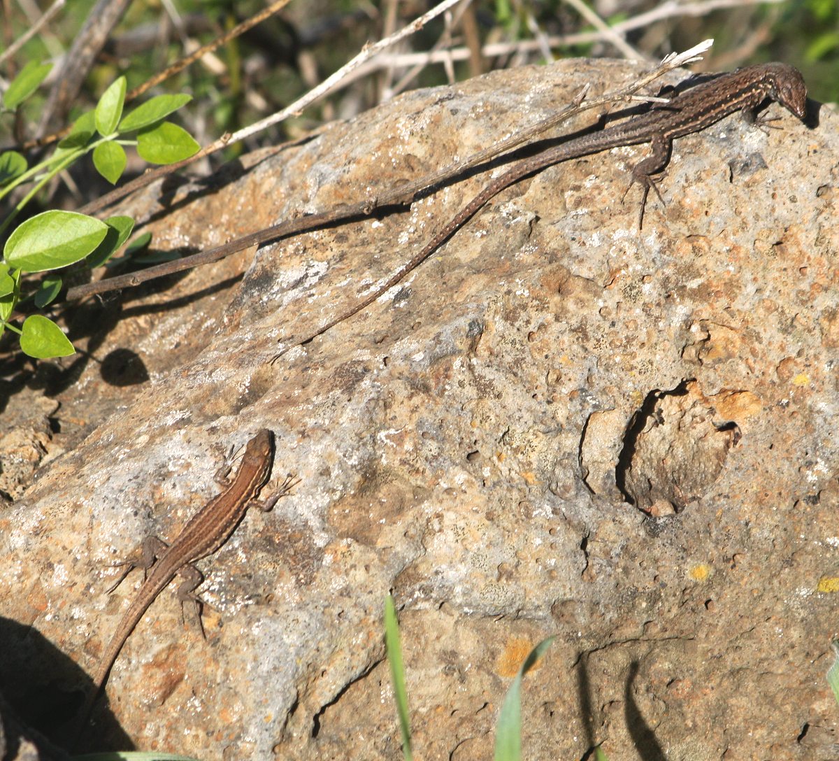 Bei längerer Beobachtung sah man die Eidechsen um die besten Sonnenplätze kämpfen. Bei dem folgenden Bild hatte das größere Tier (oben) gerade das kleinere Exemplar (unten) vertrieben.