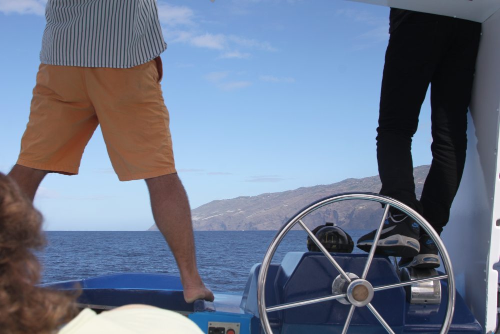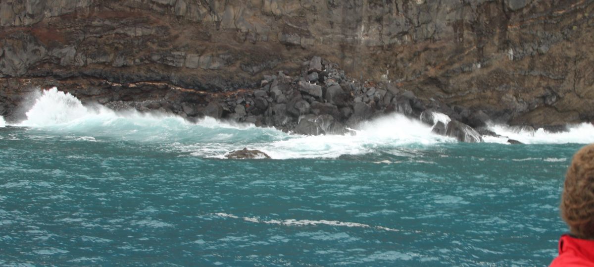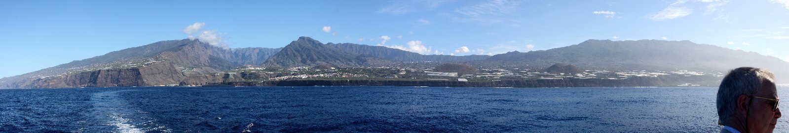 Interessant war der Blick zurück zur Insel. Links ist die Steilküste zu sehen, deren Abrutschen nach Ansicht einiger Geologen zu einem Mega-Tsunami führen könnte.