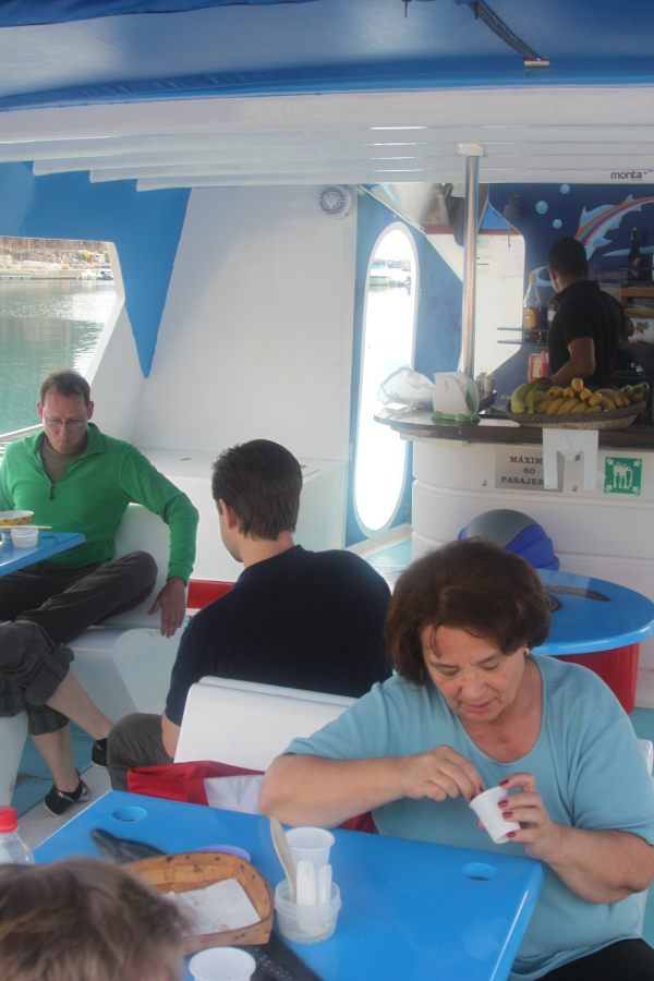 Leider konnte auf unserer Tour kaum jemand das Essen genießen. Wegen des heftigen Seegangs legten die Speisen oft einen Rückwärtsgang ein.... Immerhin haben wir etwas gesehen. Etwa ein Drittel der Touren bleibt ohne Sichtung, doch bei unserer Reise spielte eine Schule Delfine mehr als 20min mit dem Schiff. Die Tiere kamen sehr nah an das Boot heran und konnten vom Bug aus fast gestreichelt werden.