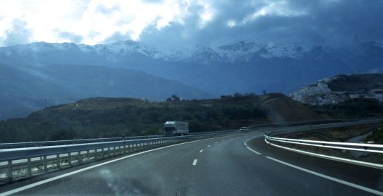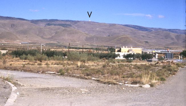 Blick von der Autobahn auf den Calar Alto. Die Kuppel ist markiert.
