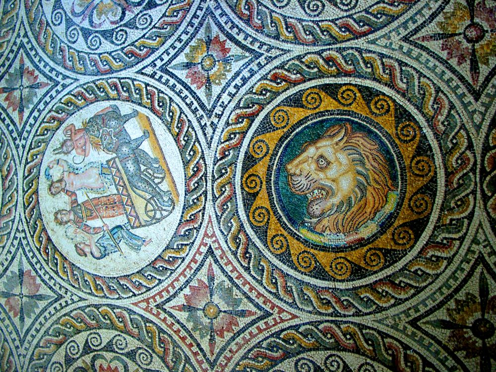 Besonders kunstvolles Mosaik eines Löwenkopfes