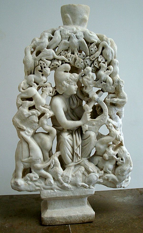 Ein Kerzenhalter mit der Orpheussage. Orpheus hatte die Möglichkeit durch sein Spiel