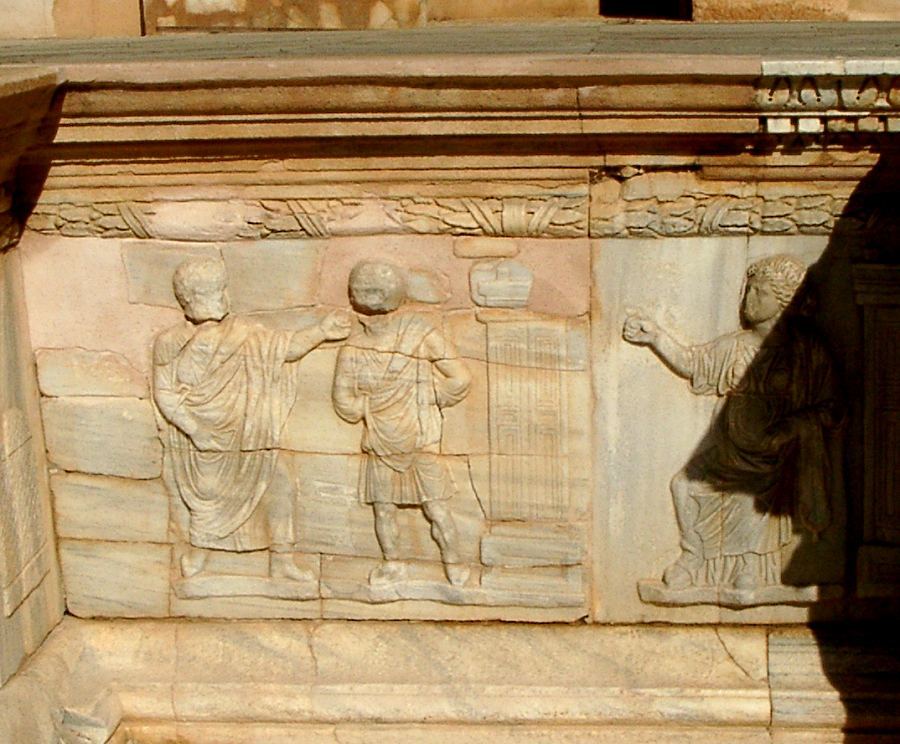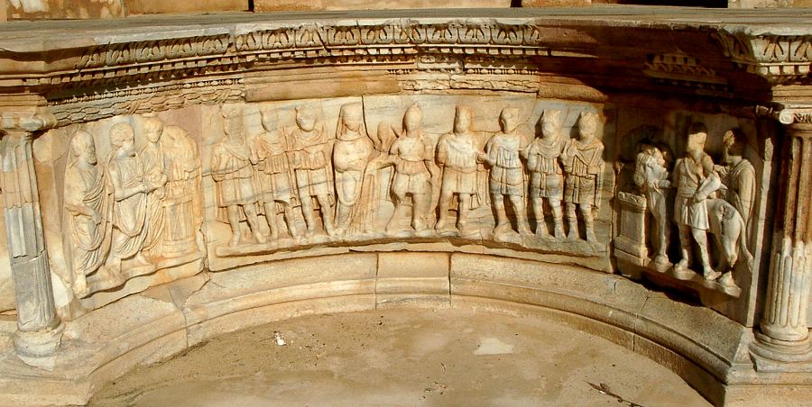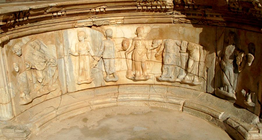 9 Musen in der Orchesterfront. Im zweiten Relief ist ein Trankopfer des Kaisers