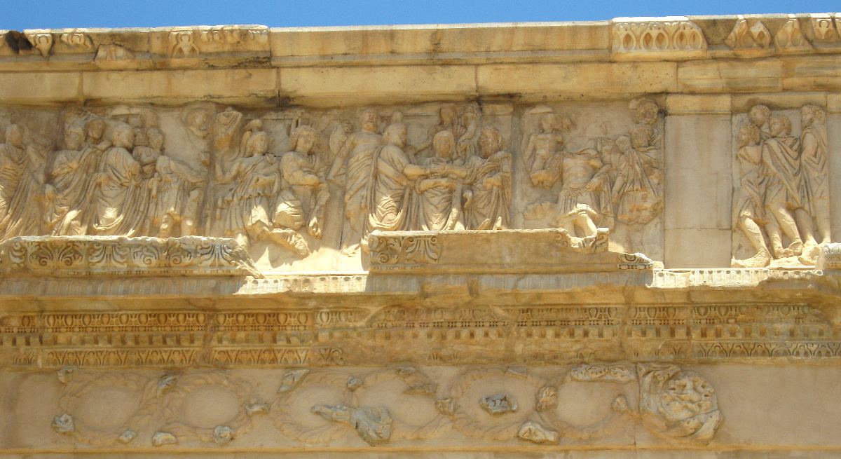 Im Fries des Bogens reichen sich die Mächtigen von Leptis und Rom die Hand.