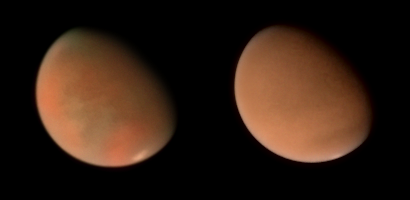 Der helle Fleck auf dem oberen Marsfoto ist etwa dort wo
