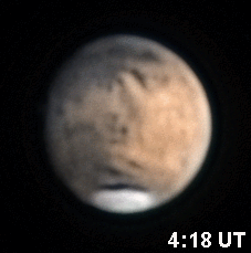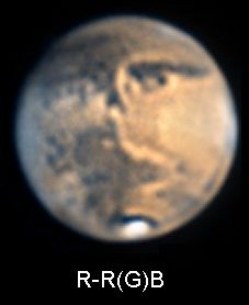 Am 3.5., 7.5. und 17.5. waren Bilder möglich. Aufällig ist der große Blauanteil. Er ist auf zahlreiche Wasserdampfwolken zurückzuführen. Das Bild vom 7.5. zeigt neben der Nordpolkappe oben auch ein helles Gebiet im Süden. Es handelt sich um Bodennebel im riesigen Hellas-Krater.